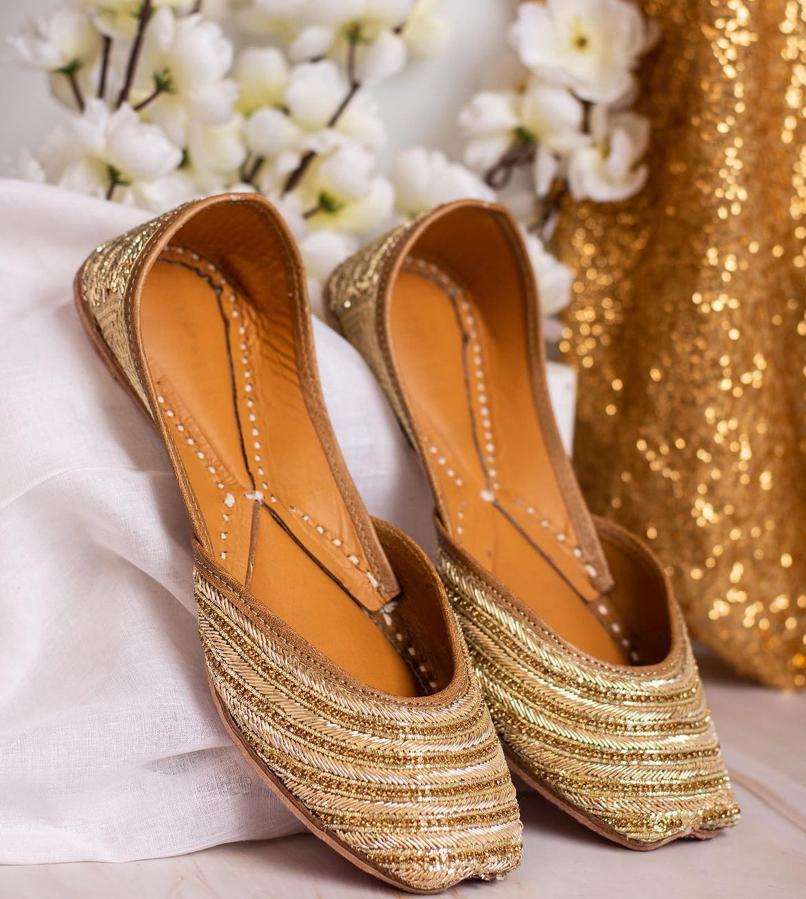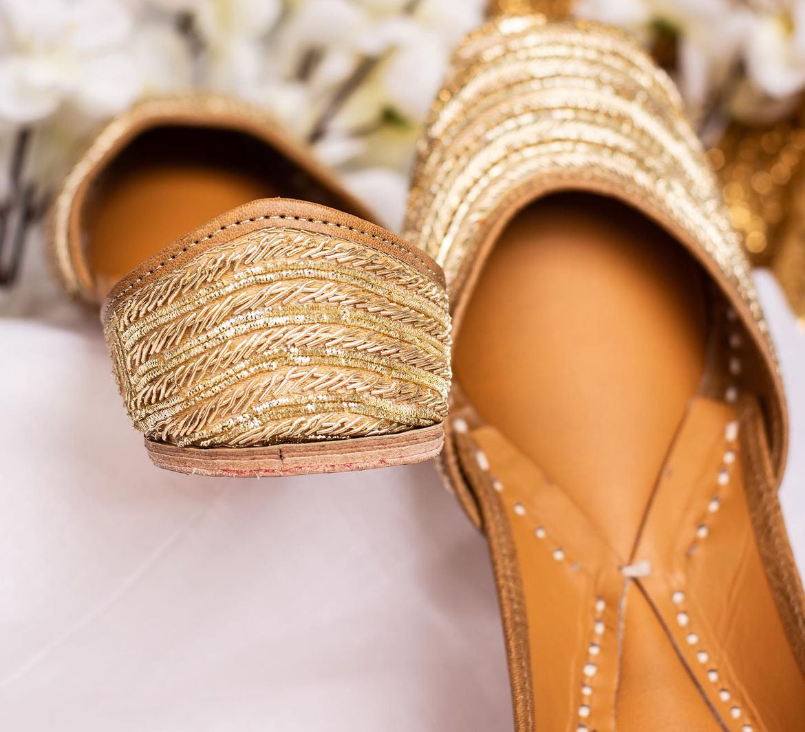 Experience the timeless allure of gold with every step you take. Our exquisite Gold Jutti, adorned with intricate gold thread work and sparkling diamantés. Crafted with precision and attention to detail, our Jutti combines traditional craftsmanship with contemporary design, making it the perfect accessory to elevate any outfit.